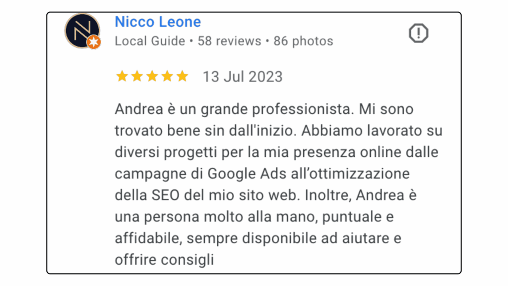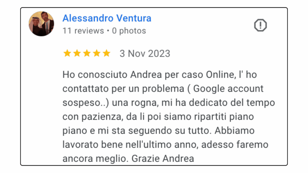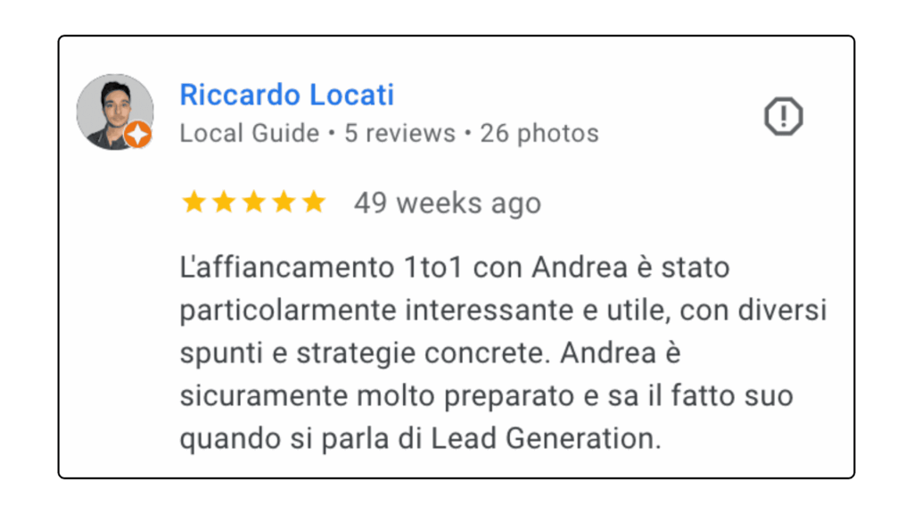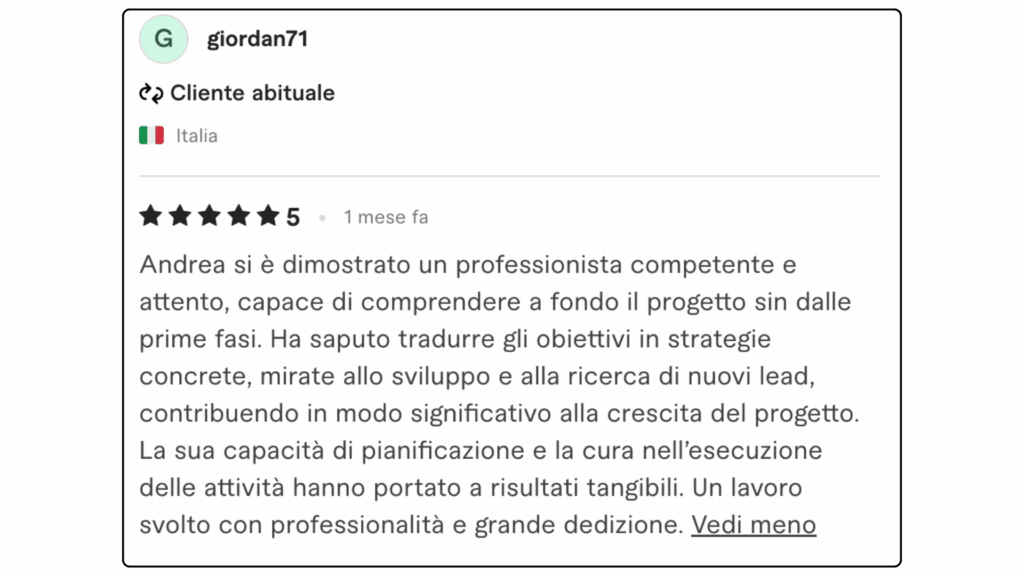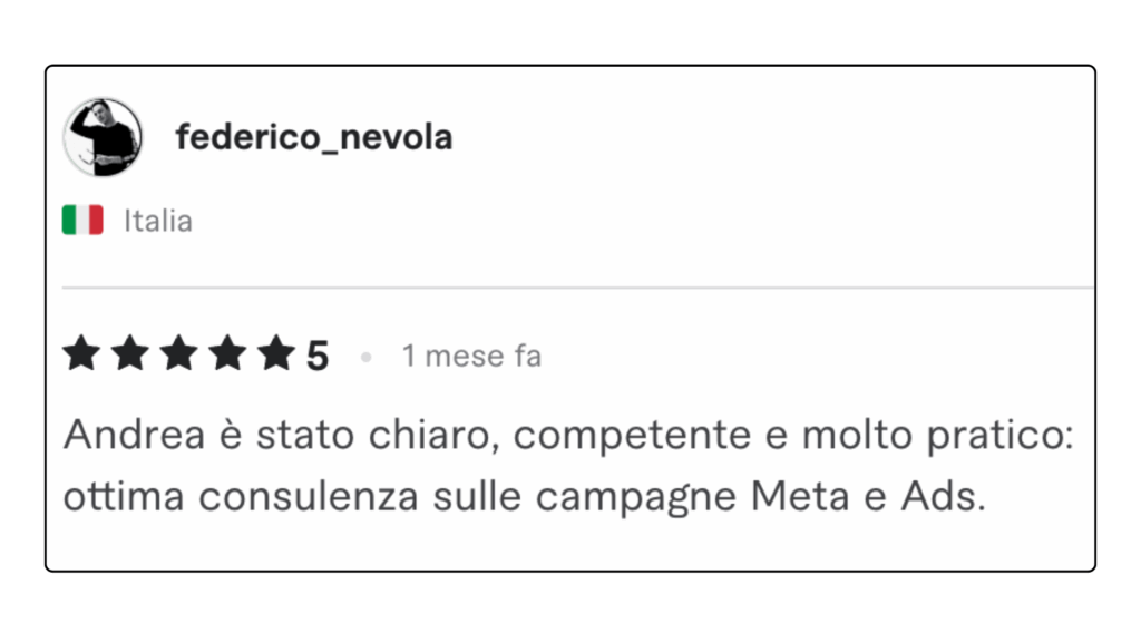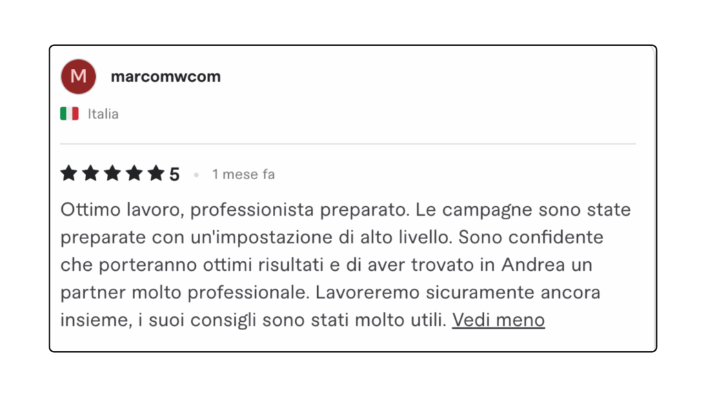ECCELLENTETrustindex verifica che la fonte originale della recensione sia Google. Ottima collaborazione e disponibilità , lavori performati in tempi ottimali in completa serietà e professionalità . Consiglio assolutamente.Pubblicato suTrustindex verifica che la fonte originale della recensione sia Google. L'affiancamento 1to1 con Andrea è stato particolarmente interessante e utile, con diversi spunti e strategie concrete. Andrea è sicuramente molto preparato e sa il fatto suo quando si parla di Lead Generation.Pubblicato suTrustindex verifica che la fonte originale della recensione sia Google. Professionalità, serietà e disponibilità! Davvero soddisfatta 🔝🔝🔝Pubblicato suTrustindex verifica che la fonte originale della recensione sia Google. Due sessioni formative svolte con Andrea... veramente in gamba. Consiglierò questa agenzia a persone che fossero interessate ad un piano di marketing.Pubblicato suTrustindex verifica che la fonte originale della recensione sia Google. Preparatissimi, tecnici e soprattutto disponibili. Grazie mille!!Pubblicato suTrustindex verifica che la fonte originale della recensione sia Google. Precisi e professionaliPubblicato suTrustindex verifica che la fonte originale della recensione sia Google. Ho conosciuto Andrea per caso Online, l' ho contattato per un problema ( Google account sospeso..) una rogna, mi ha dedicato del tempo con pazienza, da li poi siamo ripartiti piano piano e mi sta seguendo su tutto. Abbiamo lavorato bene nell'ultimo anno, adesso faremo ancora meglio. Grazie AndreaPubblicato suTrustindex verifica che la fonte originale della recensione sia Google. Le mie campagne pubblicitarie sono state elaborate perfettamente, super soddisfatto veri professionisti.Pubblicato suTrustindex verifica che la fonte originale della recensione sia Google. Andrea è un grande professionista. Mi sono trovato bene sin dall'inizio. Abbiamo lavorato su diversi progetti per la mia presenza online dalle campagne di Google Ads all’ottimizzazione della SEO del mio sito web. Inoltre, Andrea è una persona molto alla mano, puntuale e affidabile, sempre disponibile ad aiutare e offrire consigli