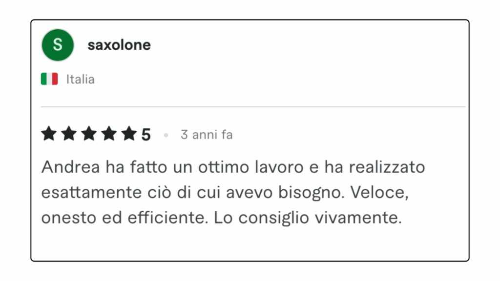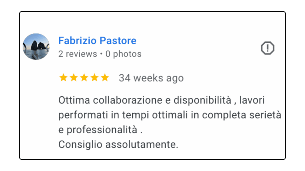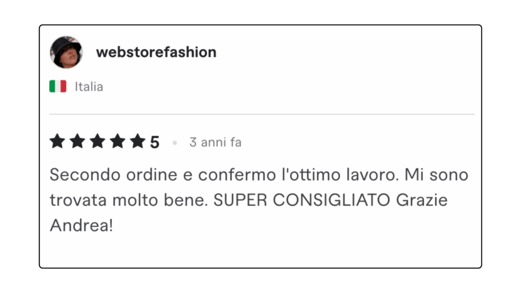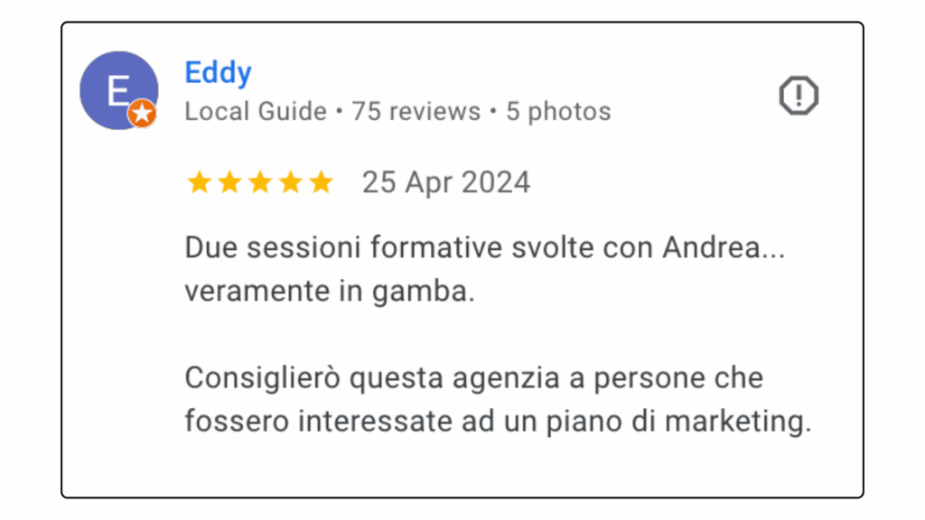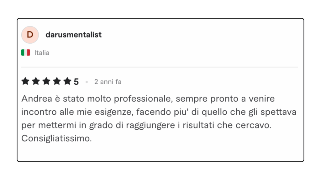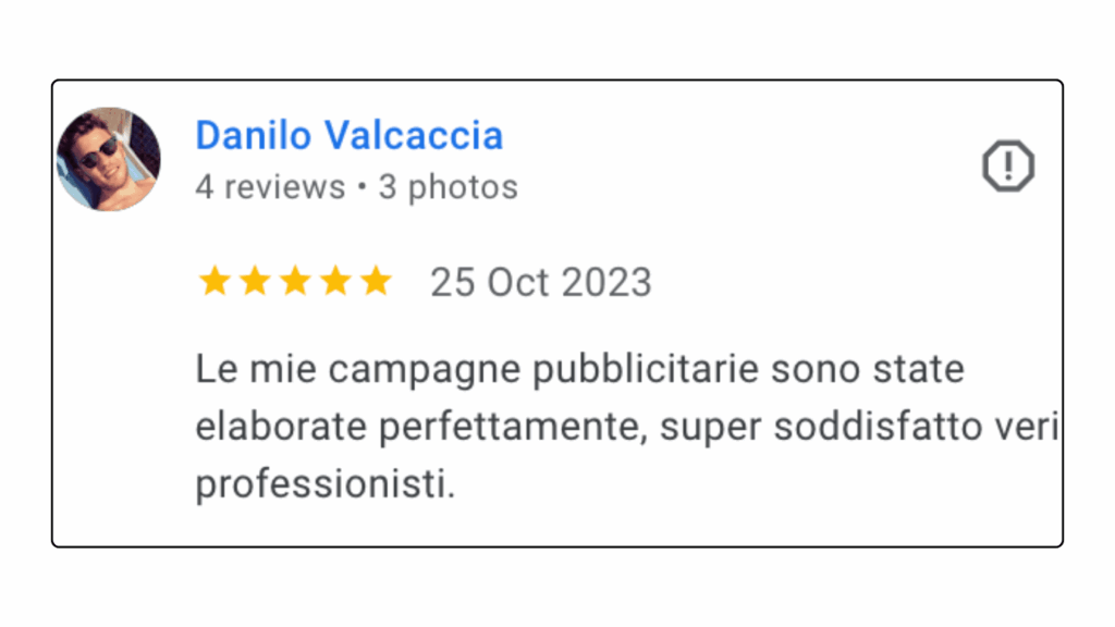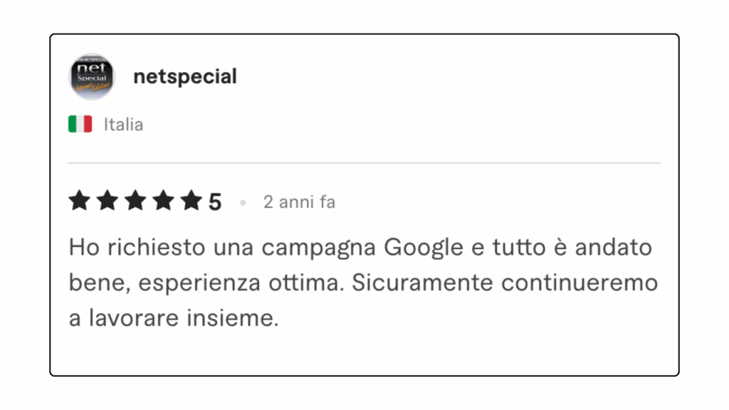 ECCELLENTETrustindex verifica che la fonte originale della recensione sia Google. Ottima collaborazione e disponibilità , lavori performati in tempi ottimali in completa serietà e professionalità . Consiglio assolutamente.Pubblicato suTrustindex verifica che la fonte originale della recensione sia Google. L'affiancamento 1to1 con Andrea è stato particolarmente interessante e utile, con diversi spunti e strategie concrete. Andrea è sicuramente molto preparato e sa il fatto suo quando si parla di Lead Generation.Pubblicato suTrustindex verifica che la fonte originale della recensione sia Google. Professionalità, serietà e disponibilità! Davvero soddisfatta 🔝🔝🔝Pubblicato suTrustindex verifica che la fonte originale della recensione sia Google. Due sessioni formative svolte con Andrea... veramente in gamba. Consiglierò questa agenzia a persone che fossero interessate ad un piano di marketing.Pubblicato suTrustindex verifica che la fonte originale della recensione sia Google. Preparatissimi, tecnici e soprattutto disponibili. Grazie mille!!Pubblicato suTrustindex verifica che la fonte originale della recensione sia Google. Precisi e professionaliPubblicato suTrustindex verifica che la fonte originale della recensione sia Google. Ho conosciuto Andrea per caso Online, l' ho contattato per un problema ( Google account sospeso..) una rogna, mi ha dedicato del tempo con pazienza, da li poi siamo ripartiti piano piano e mi sta seguendo su tutto. Abbiamo lavorato bene nell'ultimo anno, adesso faremo ancora meglio. Grazie AndreaPubblicato suTrustindex verifica che la fonte originale della recensione sia Google. Le mie campagne pubblicitarie sono state elaborate perfettamente, super soddisfatto veri professionisti.Pubblicato suTrustindex verifica che la fonte originale della recensione sia Google. Andrea è un grande professionista. Mi sono trovato bene sin dall'inizio. Abbiamo lavorato su diversi progetti per la mia presenza online dalle campagne di Google Ads all’ottimizzazione della SEO del mio sito web. Inoltre, Andrea è una persona molto alla mano, puntuale e affidabile, sempre disponibile ad aiutare e offrire consigli